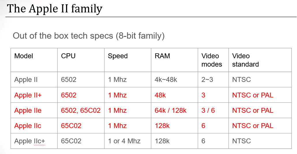 Like many computers of the same era, the Apple II is not one computer but a line of computers. I could describe them in details but that would not be relevant, let’s just list the major models with their main specs, if you aren’t familiar with them.